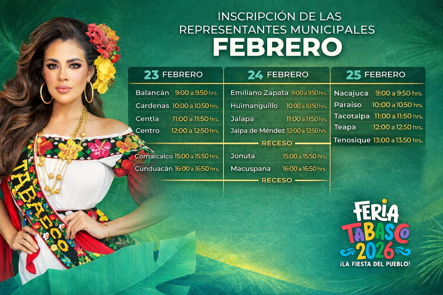 Este lunes 23 de febrero comenzará oficialmente el proceso de inscripción de las representantes municipales que participarán rumbo a la Feria Tabasco 2026, en una de las etapas más esperadas de la máxima fiesta de las y los tabasqueños.