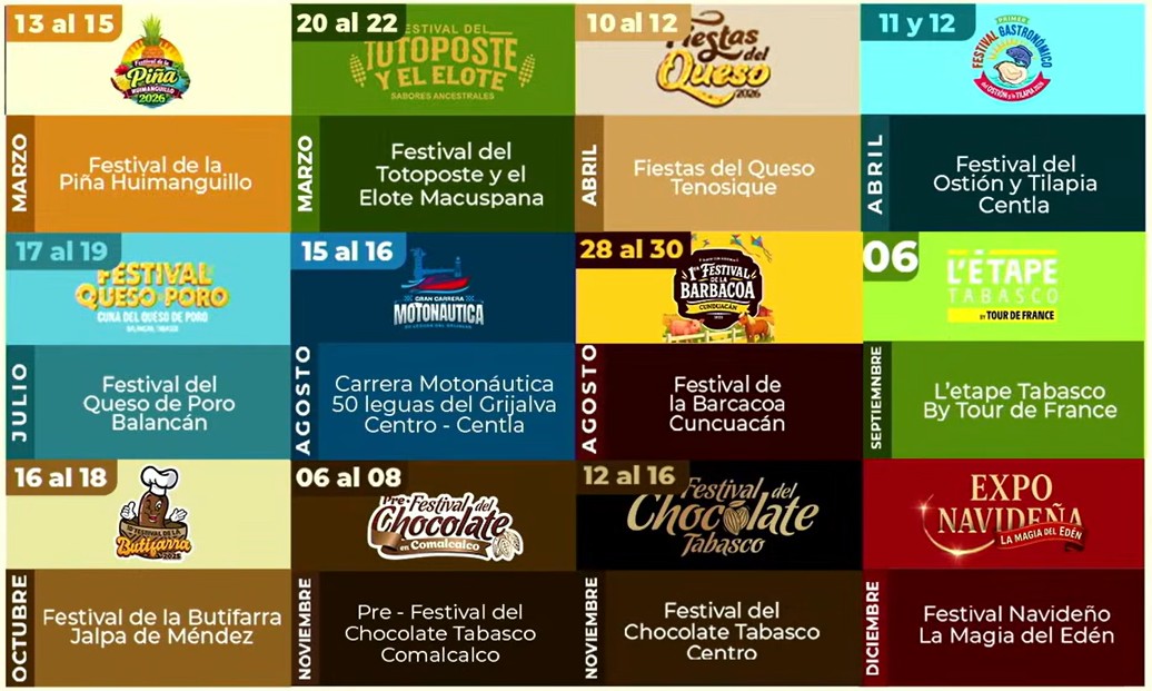 La Secretaría de Turismo y Desarrollo Económico anunció el calendario de Festivales Tabasco 2026, un paquete de eventos que complementará a la tradicional Feria Tabasco y que se desarrollará en coordinación con los municipios.