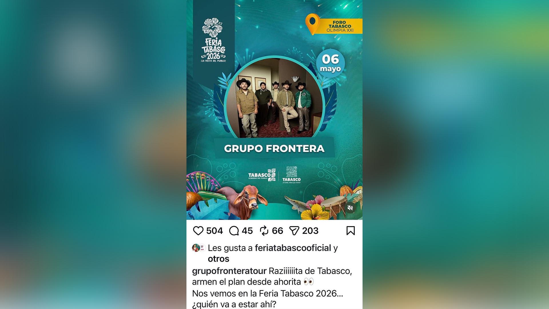 Villahermosa.- Luego de varios días de incertidumbre, Grupo Frontera confirmó oficialmente su participación en la Feria Tabasco 2026, tras publicar en sus redes sociales la agenda de su gira, en la que aparece Villahermosa como una de sus fechas.